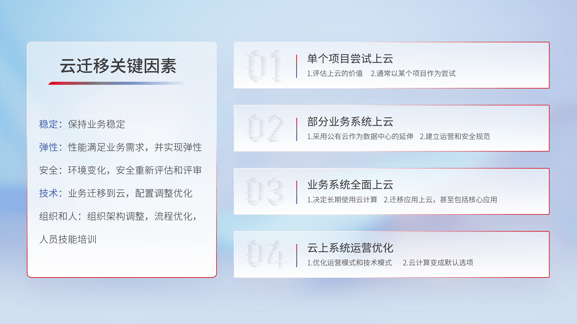 结合实际业务,,从规划设计、、云平台选型、、、云原生改造、、数据迁移、、、、集成交付,,,,迁移全过程为客户识别最佳上云路径,,,做好风险识别管理,,,设计网络架构、、、、身份权限、、、安全审计合规、、、操作审计、、日志审计、、、、监控告警策略、、、、多站点容灾设计等,,对云上基础设施进行整体规划,,,,提升IT治理水平,,,以满足弹性、、高可用、、高性能的需求。。。。