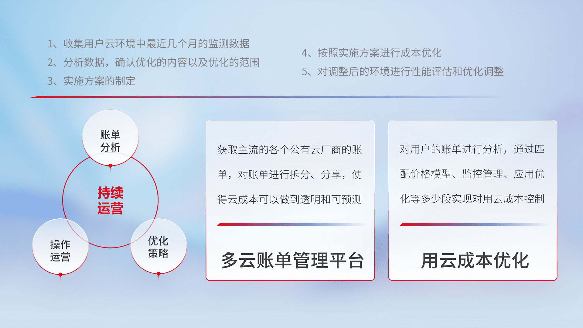 通过灵活运用多种自动化迁移工具,,帮助企业用户实现业务和数据高效 、、、、稳定的上云迁移和云上迁移,,采用自研多云纳管平台,,,,以中立管理模式,,,,解决多组织、、、多云、、、、多运维厂商的复杂关系的管理,,保证多云平台资源配置的一致性,,,实时掌控云资源运行数据,,,运用智能化工具分析云资源多云平台的管理服务,,,透明化管理成本支出,,,用云成本可预测、、、、用云费用可优化、、、、云资源配额有据可依。。。。