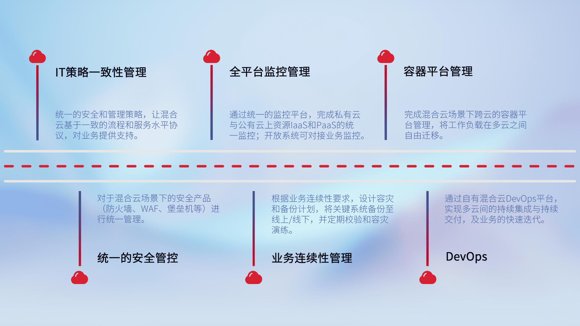 通过多云纳管,,以统一的资源数据模型把客户的云资源进行抽象和封装,,,,进而实现对多云资源的统一操作,,保障云资源管理的可靠性、、、、稳定性与可用性。。。。量身定制化运维内容,,,,配置、、、开发运维、、、、补丁管理、、、、备份、、、监控、、、、认证和访问管理、、、审计和日常巡检等,,,,保障在用云过程中的可靠度,,稳定度以及高可用率。。。